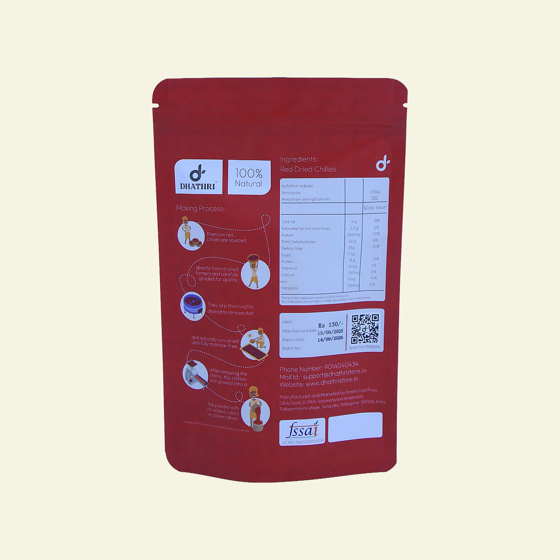 Dhathri Chilli Powder is made from carefully selected, sun-dried red chillies they are stem removed that are stone-ground to perfection. The result is a vibrant red powder with an intense flavor and natural aroma. Free from preservatives and artificial colors, our chilli powder adds heat, color, and authenticity to your dishes.