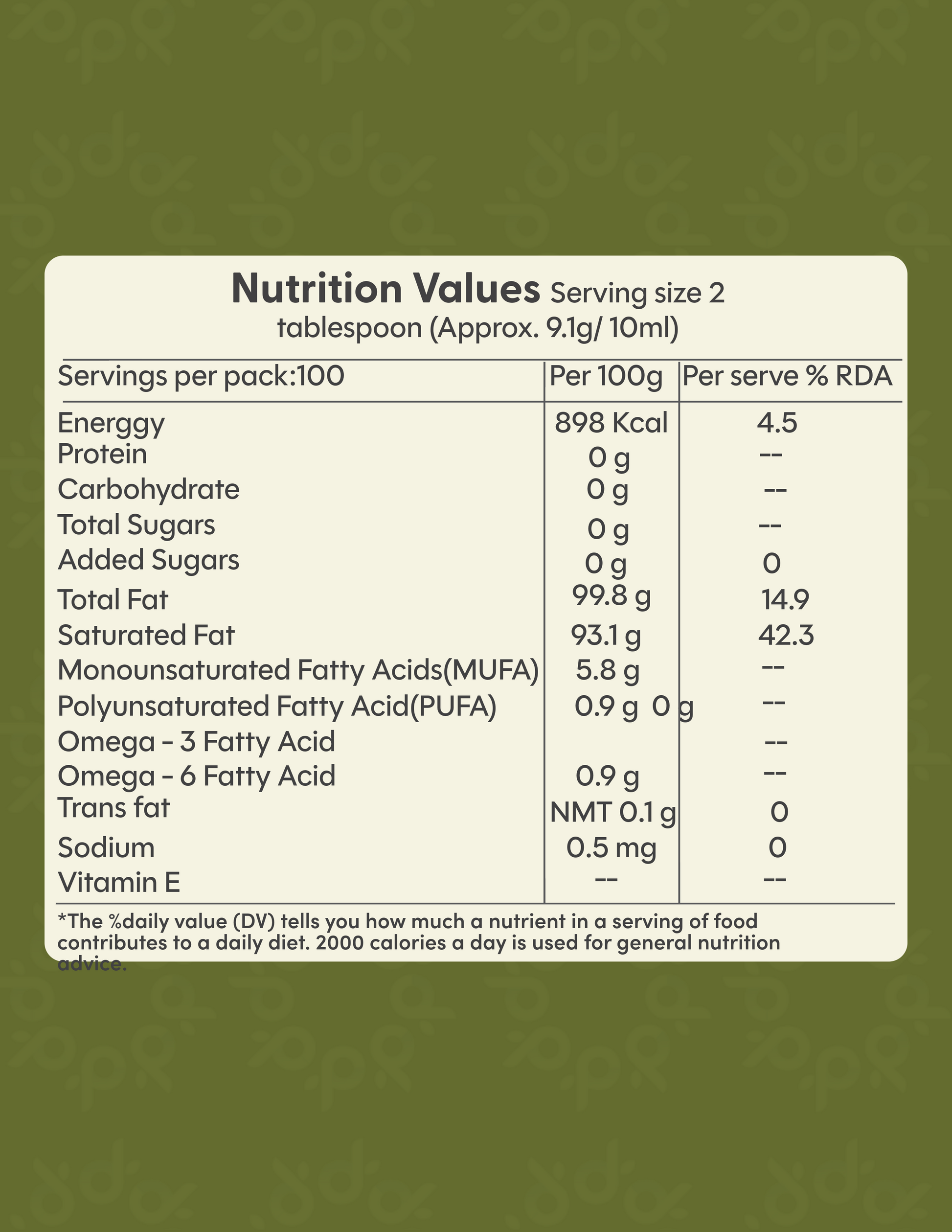 Dhathri Cold Pressed Coconut Oil is made from whole copra (dried coconut kernels) sourced from farms. The traditional wooden ghani extraction method keeps all nutrients, aroma, and purity intact. It’s versatile — ideal for cooking, skin care, and hair nourishment. With no chemical refining or additives, Dhathri Coconut Oil delivers freshness and authenticity you can taste and feel.
